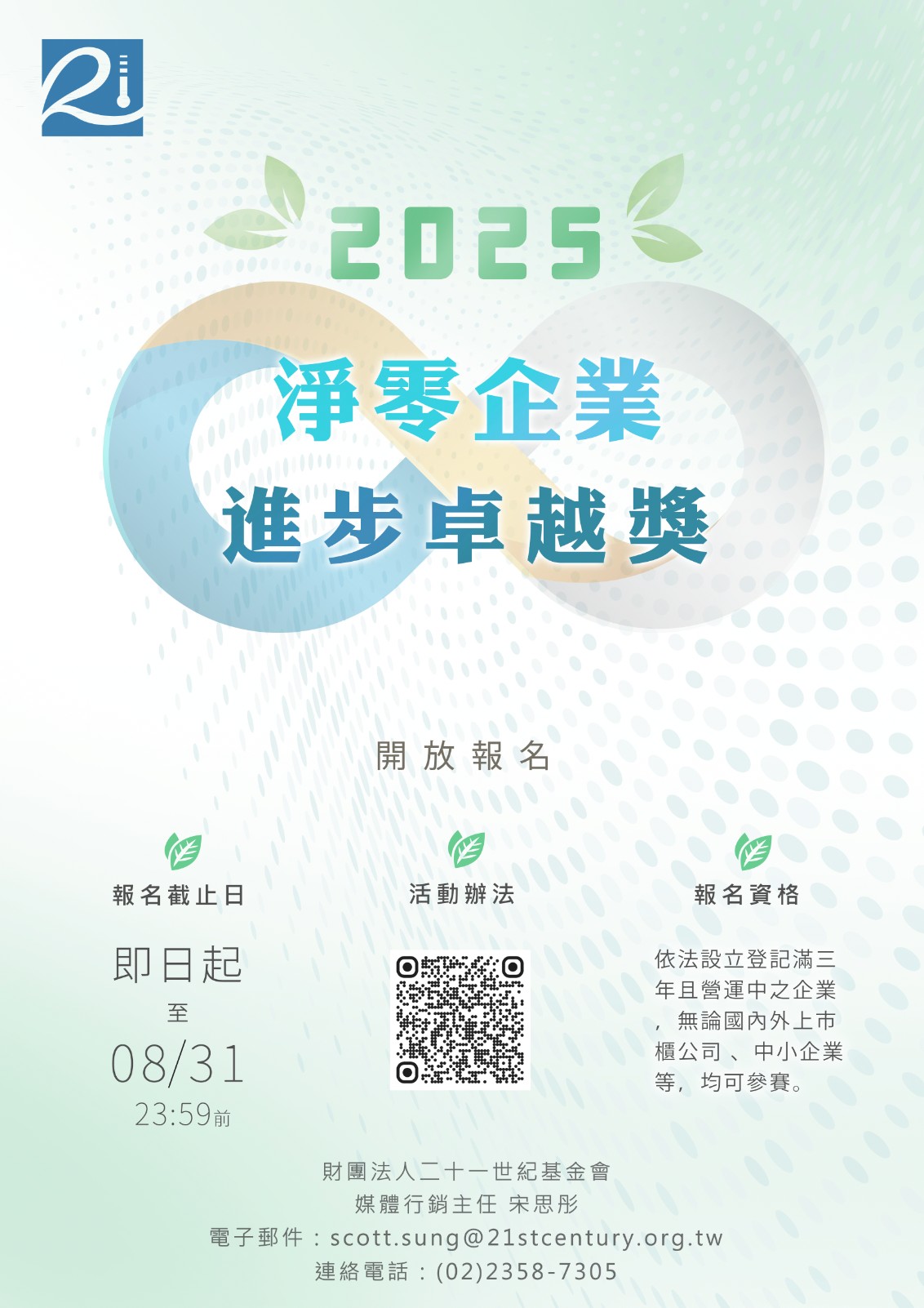 財團法人二十一世紀基金會為擴大倡議落實淨零永續發展理念, 2025年特舉辦「淨零企業進步卓越獎」,不限產業領域、不限國內外上市櫃公司,開放各界好手報名,讓「卓越」不只是標章,更是企業邁向淨零與永續未來的行動指南。