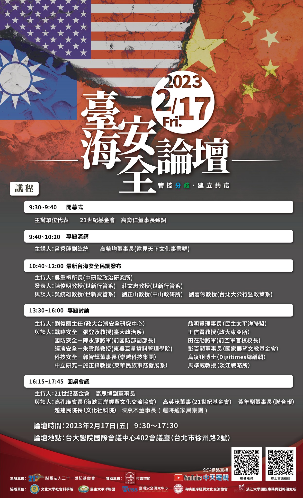 美中關係風起雲湧,台海兩岸山雨欲來。關心台海安全,期許兩岸和平,關鍵時刻請踴躍參與「台海安全論壇」