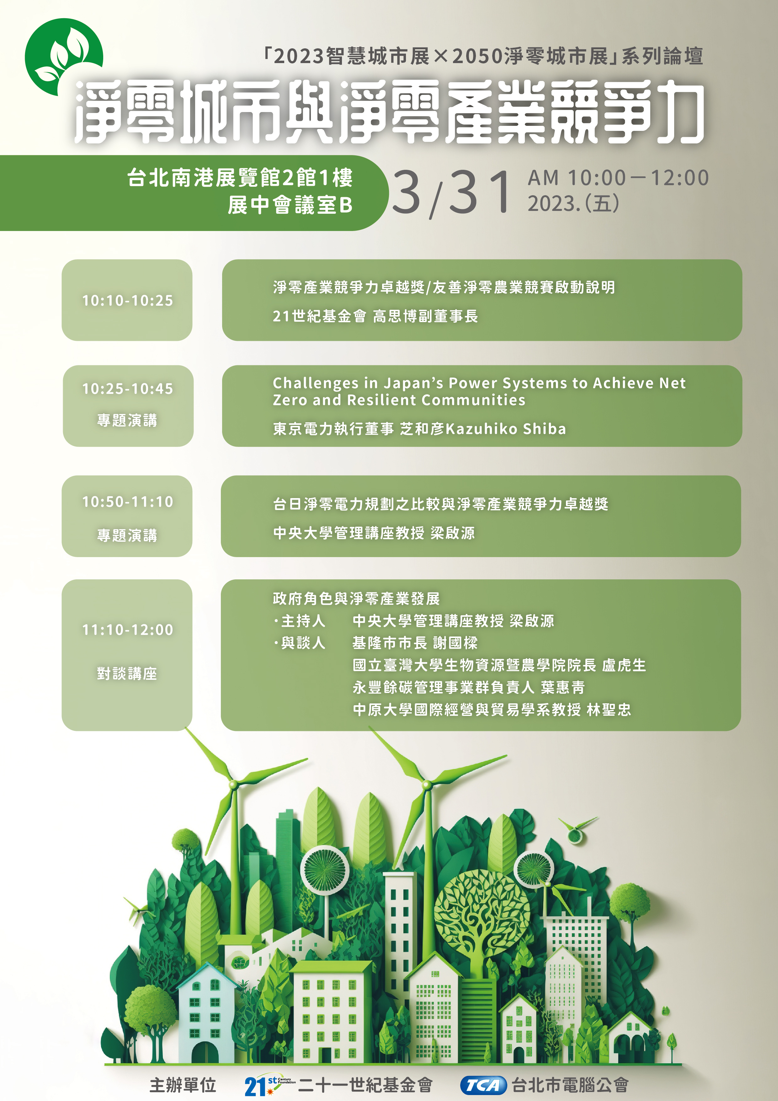 二十一世紀基金會與台北市電腦工會合作,謹訂於2023年3月31日上午舉辦「淨零城市與淨零產業競爭力」論壇,特別邀請東京電力執行董事芝 和彦 (Kazuhiko Shiba)先生分享未來能源產業淨零發展,如何與公私部門合作,推動新技術的開發以及商業模式,落實綠色永續環境。並邀請基隆市市長謝國樑先生以及產官學研各界先進進行經驗分享以及深度交流,誠摯邀請各界關心淨零城市與產業競爭力人士一同參與。此外,論壇中也將首次啟動「淨零產業競爭力卓越獎」以及「友善淨零農業競賽」,希冀鼓勵各企業及農業團體,透過能源效率提升、低碳能源轉型、循環經濟導入等策略,響應全球及國家的淨零排放行動。